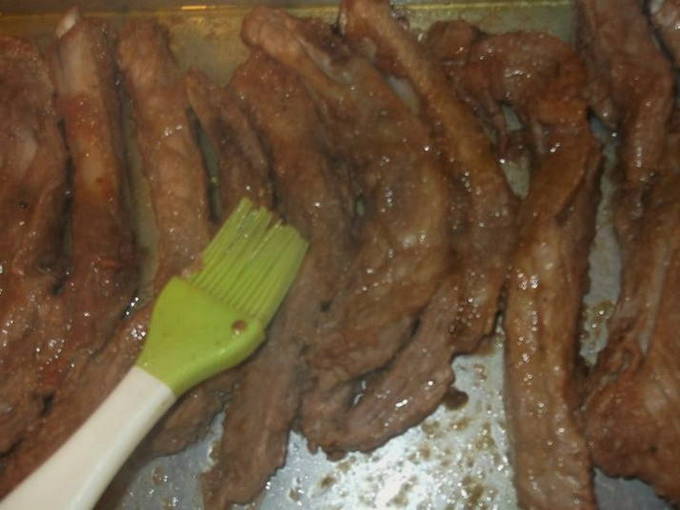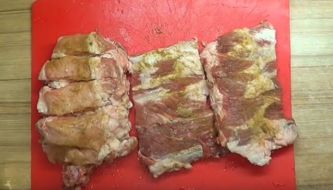 Невелику частину отриманої підливи завдають на фольгу. Зверху укладають шматок реберної частини, причому кістки повинні бути розташовані зверху. Натирають приправами та покривають соусом.