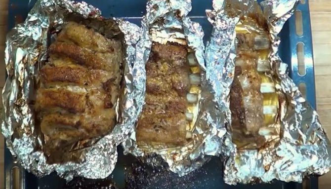 3. кладемо на деко відрізки фольги, ними кладемо реберця і загортаємо їх те щоб верхня частина залишилася відкритої. Така упаковка дозволить м’ясу підрум’янитися і соки не випустить, зробивши його соковитим і ніжним.