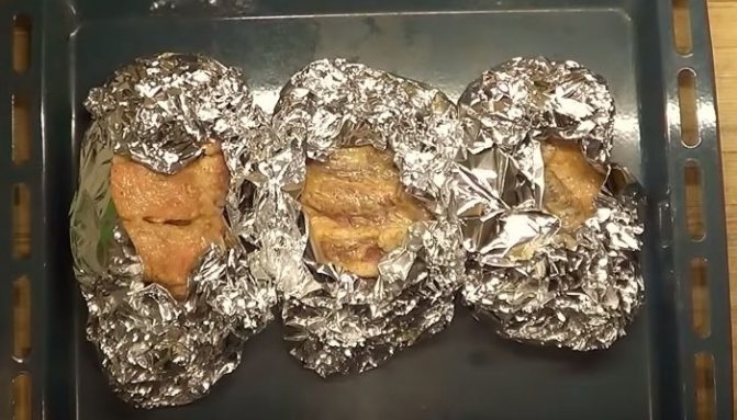Усі ретельно пакують у фольгу, при цьому намагаються перекрити доступ повітря. На деку в добре розігрітій до 180 ° C духовці м’ясо готується 50 хвилин .