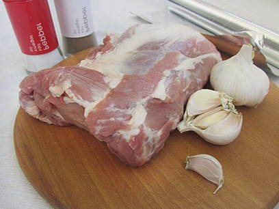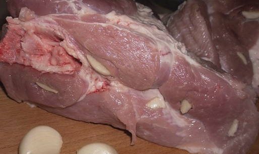 - Свинину помийте, обсушіть, зробіть невеликі надрізи та вставте в них зубчики часнику.