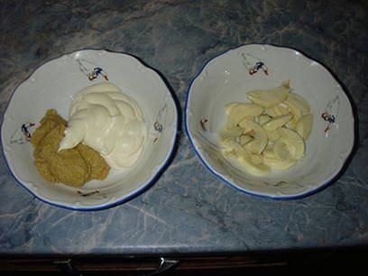 - Часник очистіть, наріжте часточками. В окремій мисці змішайте гірчицю, майонез, сіль та перець.