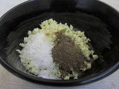 - Часник очистіть і дрібно наріжте ножем. У мисці змішайте часник, сіль та мелений перець.