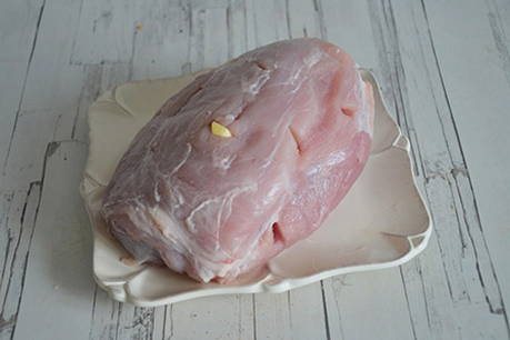 - Свинину помийте та обсушіть паперовими рушниками. Очистіть 5-6 зубчиків часнику, наріжте їх платівками. У м’ясі зробіть невеликі надрізи і вставте часник.