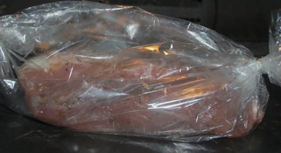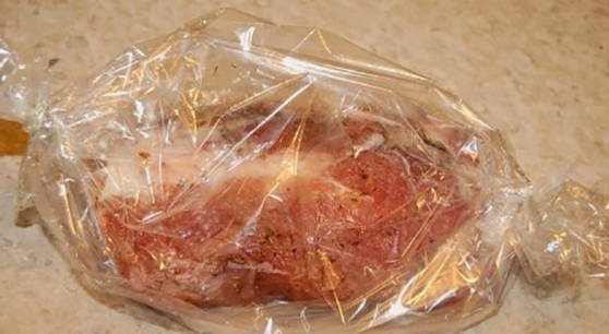 - М’ясо покладіть у рукав для запікання, закріпіть краї з двох сторін.
