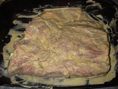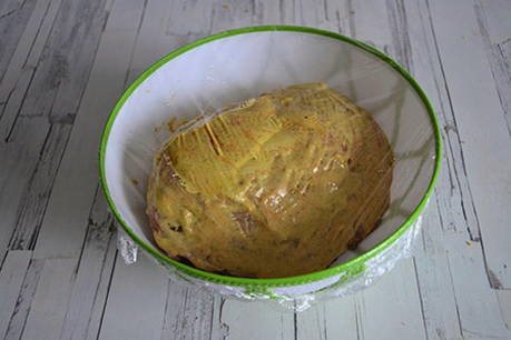 - За допомогою силіконового пензлика нанесіть на м’ясо гірчицю. Перекладіть м’ясо в миску, затягніть її харчовою плівкою і поставте маринуватися в холодильник на 5-8 годин.