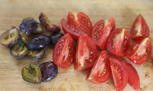 - Помідори та сир наріжте тонкими пластинками. У м’ясну гармошку вкладіть часточки сиру та помідорів.