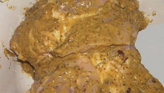 - Для маринаду змішайте гірчицю, соєвий соус, олію, винний оцет, сіль та сухі спеції.