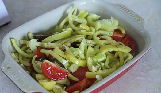 - У жароміцну форму викладіть нарізані овочі, посипте сіллю, додайте подрібнений часник, влийте пару столових ложок олії та перемішайте.