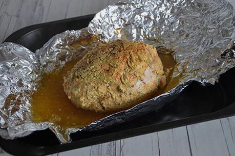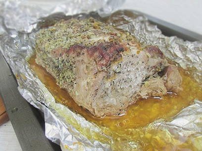 - М’ясо оберніть у фольгу, перекладіть його в жароміцну форму. Помістіть м’ясо в духовку, розігріту до 190 градусів на 50 хвилин. Потім розгорніть м’ясо і дайте йому підрум’янитися ще 20 хвилин у духовці.