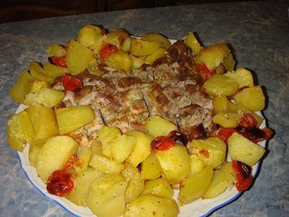 Ситна страва, яку можна приготувати на велику компанію. Свинина запікається разом із картоплею, завдяки чому ви отримуєте відразу основну страву та гарнір до неї.