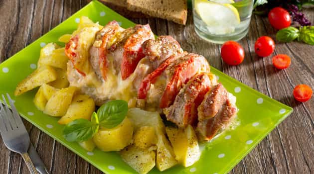 При подачі шматки легко відокремити по зробленим надрізам. Гарніром служать будь-які овочі, салати.