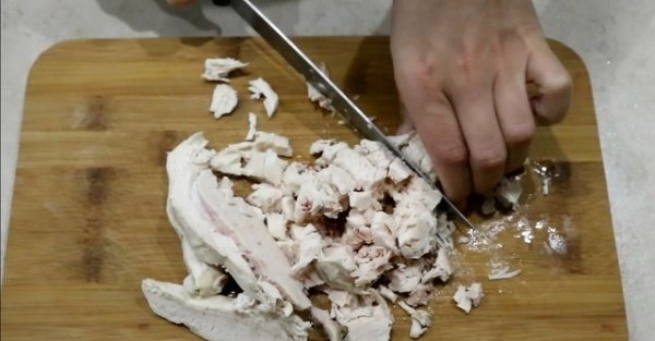 - Гаряче м’ясо належить дістати з бульйону, остудити, потім нарізати кубиками середнього розміру.