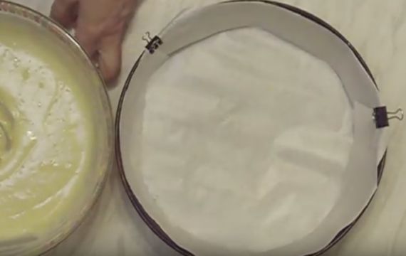 - Беремо круглу форму для випічки (у нас 26 см у діаметрі), застилаємо дно пергаментом для випічки, краї можна нічим не змащувати.