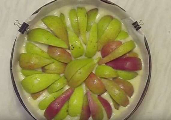 - Форму для запікання викласти на лист, застелити пергаментом. Залити тісто усередину. Другу грушу нарізати скибочками, викласти зверху, трохи вдавлюючи шматочки всередину.
