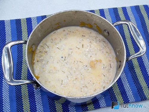 Доводимо до закипання 0,6 л молока, трохи солимо і засипаємо геркулесові пластівці.