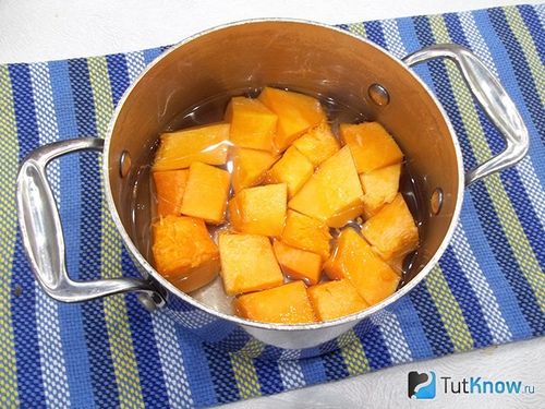 1. Гарбуз очистіть від шкірки, наріжте скибочками і закиньте у варильну каструлю. Залийте питною водою та варіть на повільному вогні після закипання близько чверті години до м’якої консистенції.
