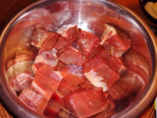 - Мите м’ясо барана нарізати великими шматками і скласти в ємність.
