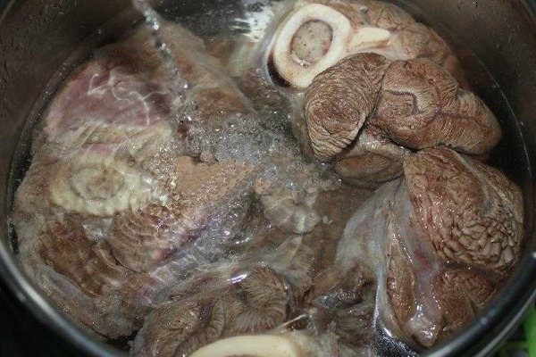 - Воду закип’ятити на вогні і кинути нарізане на великі шматки м’ясо. Після того як бульйон закипить, її необхідно злити, промити м’ясо і залити кип’яченою водою. Можна поміняти посуд.