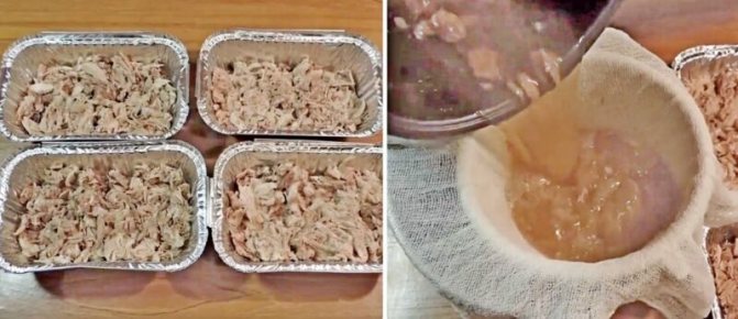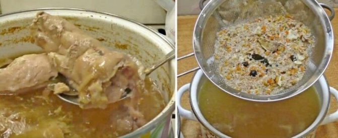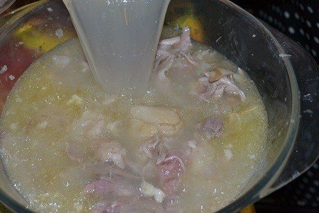 3.Коли все звариться, вийміть всі тверді частинки, а бульйон процідіть через сито в окрему ємність (вийде близько 2,5 л). Розберіть м’ясо від неїстівних частин.