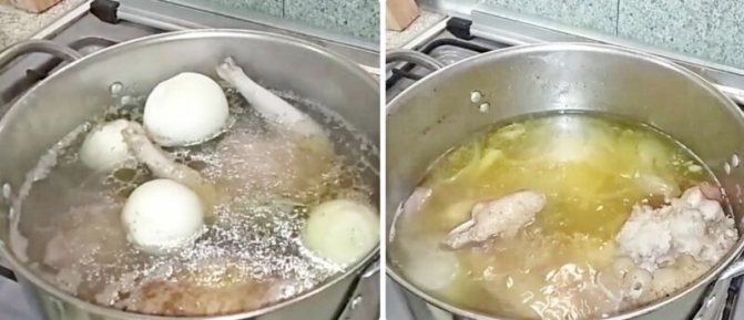 - Рульку ретельно миємо у воді, скоблимо шкіру, рубаємо її на 2-3 частини. Повторно промиваємо водою, відправляємо у каструлю. Курочку також добре споліскуємо, рубаємо на 2 половини, відправляємо до рульки. М’ясо заливаємо водою, чекаємо кипіння, закипілу воду виливаємо. М’яско і посуд добре промиваємо, повторно наповнюємо каструлю водою, закип’ячуємо.