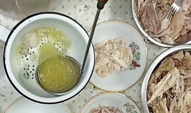 - З теплого бульйону витягуємо курку з ніжкою. Очищаємо часник, трьом його на дрібну тертку, кладемо в теплий бульйон. Прикриваємо каструлю, даємо настоятися чверть години. Потім бульйон проціджуємо, зверху збираємо зайвий жирок. Пробуємо, якщо потрібно додаємо сіль та спеції. М’ясо розбираємо та подрібнюємо.