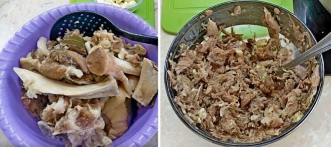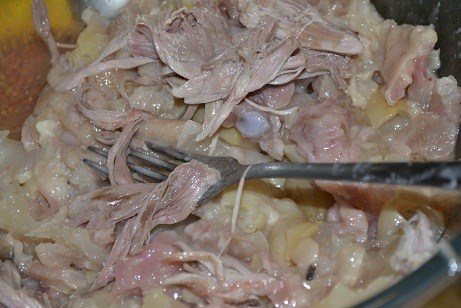 М’ясу дати охолонути. Відокремити м’якоть від кісток. Ретельно перебрати вилочкою.