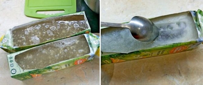 5.Виберіть форми, в яких охолоджуватимете холодець зі свинячих ніг. Якщо зараз весь посуд зайнятий під салати та інші смаколики, можна використовувати звичайні тетрапаки з-під соку. Просто виріжте отвори, як це показано на фото нижче.