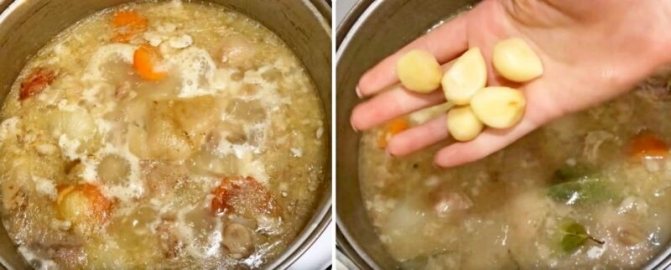 5. Видавіть через прес часник у рідку складову та підігрійте бульйон, але не доводьте до кипіння. При нагріванні часник краще віддасть свої ефірні олії і холодець буде приємно пахнути.