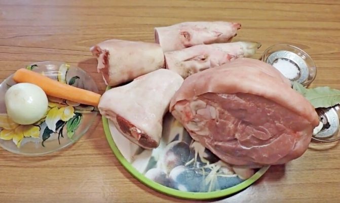 1,5 кг свинячих ніжок, 1 цибулина, 2 моркви, 1 корінь петрушки, 1 корінь селери, 4 лаврові листки, 3-4 ягоди ялівцю (за бажанням), 3-4 зубчики часнику, зелень кропу, сіль.