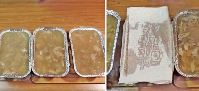 11. А тепер цікавий лайфхак для тих, хто не любить білий застиглий жир зверху холодця. Складіть паперовий рушник і промокніть їм верх колодця. Жир «піде» на папір.