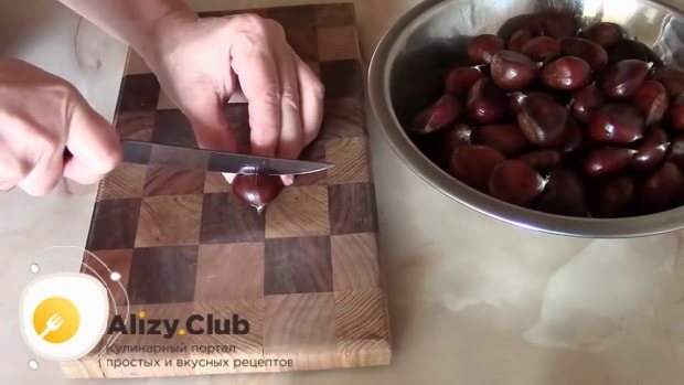 1. Промити 2 кг горіхів каштану, обсушити, покласти плоскою стороною на дошку та ножем зробити хрестоподібний надріз, щоб під час приготування вони не вибухали.