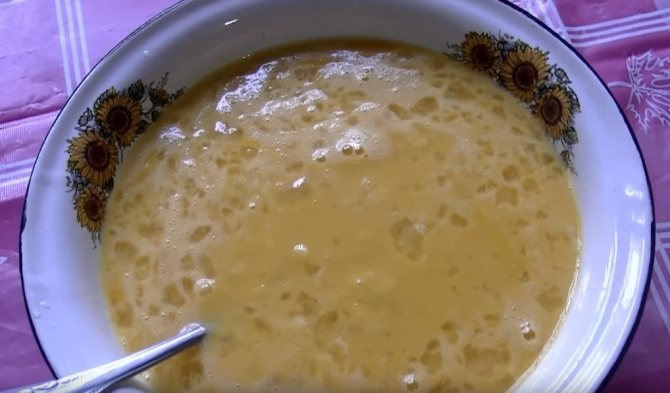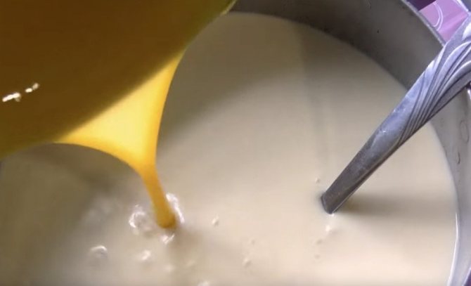 2. В отриману масу влити склянку суміші з молока та молозива і знову перемішати.