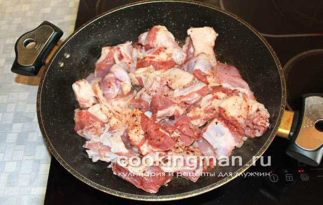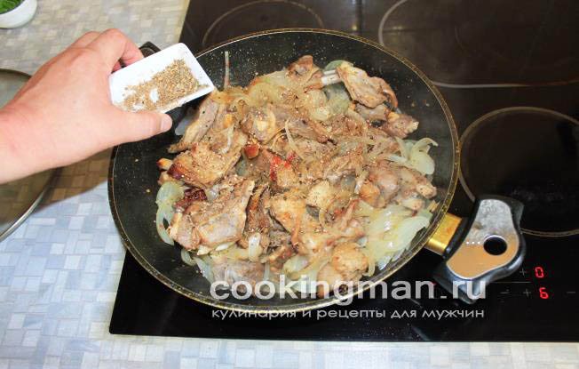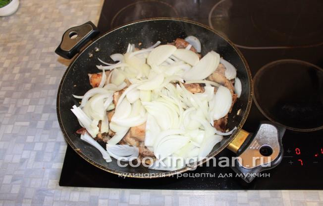 - Очистіть і поріжте півкільцями цибулю. Додайте його до баранини і посмажте реберця протягом 10 хвилин разом з ним.