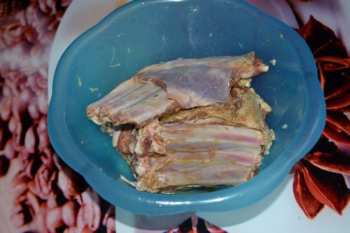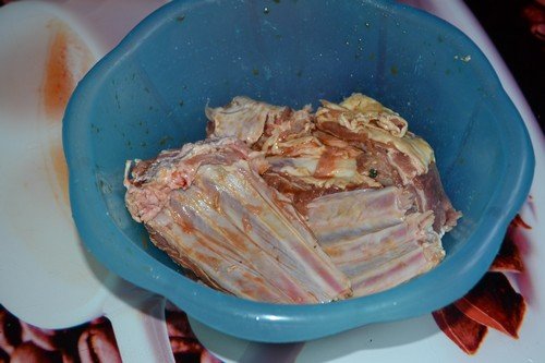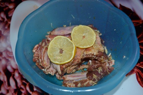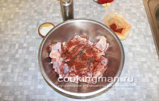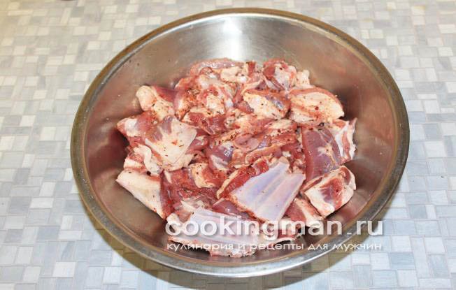 М’ясо слід ретельно промити, нарубати шматочками (довжина – 10 см) та помістити в маринад. Шматочки акуратно обмазують маринадом і залишаються в ньому на 3-4 години. Буде краще, якщо вони пролежать у ньому ніч і добре просочаться.