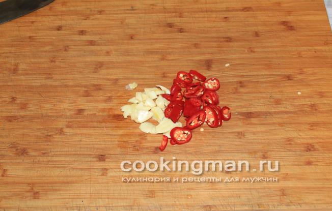 Потім очищаються овочі. Цибуля нарізається невеликими кільцями. Часник добре продавлюється. Компоненти додаються до маринаду.