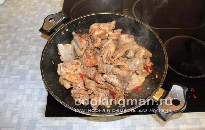 На скороді розігрівається олія. Коли воно закипає, туди поміщається баранина, яку потрібно час від часу перемішувати. Після утворення гарної скоринки слід зменшити вогонь. Потім ребра заливаються маринадом, у якому перебували до смаження. Сковорода накривається кришкою, блюдо має гасити 1,5 години.