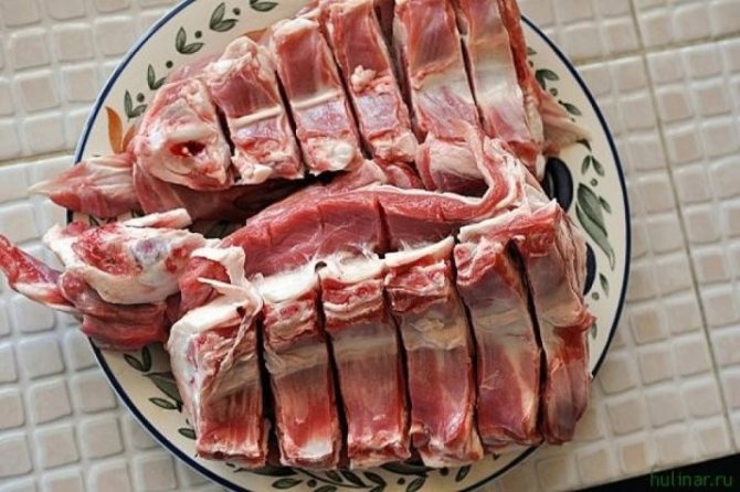 1. Насамперед, потрібно розрубати баранячі ребра на частини. Більш компактні шматочки завжди будуть апетитніше виглядати на блюді, ніж довгі.