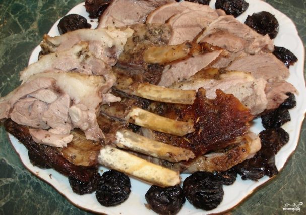 1. Підготуємо інгредієнти. М’ясо розморожуємо, обмиваємо і просушуємо, а чорнослив заллємо окропом, нехай трохи набрякне.