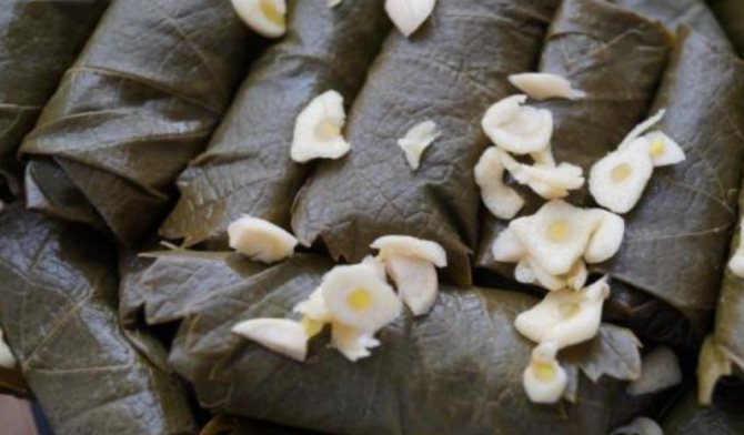 - Розмістити долму у формі для випікання. Посипати подрібненим часником.