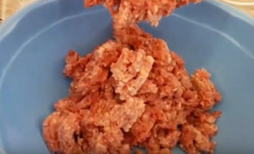 - В окремій мисці 500 г м’ясного фаршу (баранина з яловичиною) перемішується з дрібно нарубаною петрушкою, сушеним базиліком, м’ятою, сіллю та перцем.