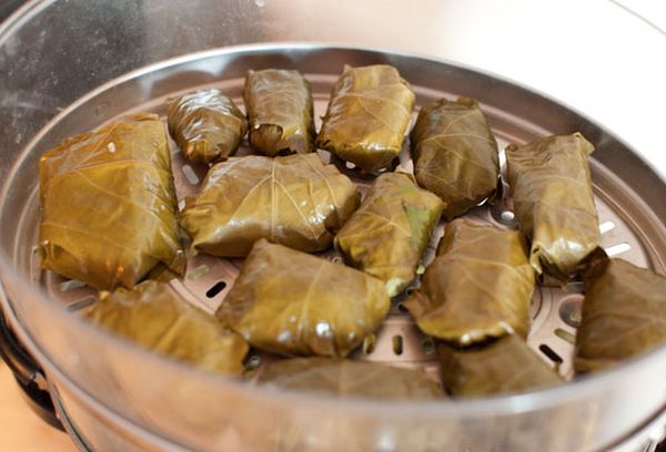 - Для розм’якшення виноградного листя використовується окріп. Молоді елементи просто ошпарюють, а вікові відварюються протягом 3-5 хвилин. Враховуючи той факт, що цей нюанс нерідко ігнорується виробниками напівфабрикатів, долму від початку до кінця краще готувати самостійно.