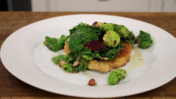 - 400 г філе птиці без сухожиль нарізається шматками, відбивається. Отримані напівфабрикати обвалюються в суміші 3 яєць із сіллю та перцем, пануються у невеликій кількості кубиків білого хліба та обсмажуються у 60 грамах вершкового масла.