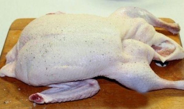 - Зсередини та зовні ретельно натирають тушку сіллю та меленим перцем.
