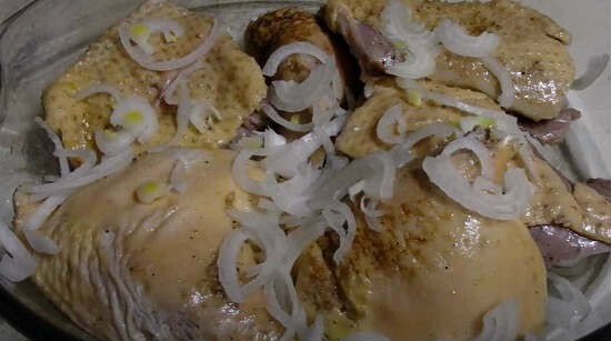 Оскільки качка – птах дуже жирний, то видаліть біля гуска товстий жовтий шар жиру. Тоді підливу не буде нудотно жирною. Потім відберіть ті частини, які готуватимете, а решту складете в пакет і відправте в холодильник. Але можете готувати відразу всю птицю.
