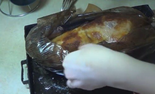 5. Рукав для запікання закріпити з одного боку, закласти в нього тушку, всередину птиці вилити маринад, що залишився. Закріпити інший кінець рукава і залишити маринуватися на 3-4 години, можна більше.