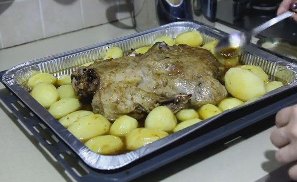 5. Тепер очистіть картоплю і покладіть її поруч із птахом, вона купатиметься в жирі і відправте запікатися на 40 хвилин.