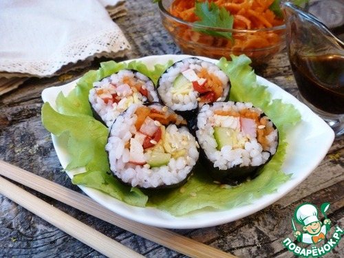 Кімпаб – це ароматні та ситні роли з Кореї, що відрізняються характерним пряним смаком. Назву вони отримали завдяки своєму вмісту: ким означає «капуста», паб – «рис». У приготуванні ці роли набагато легші і доступніші, ніж японські. До складу других входять червона риба та м’який вершковий сир. Проте простота та доступність рецепту кімпабу з Кореї не робить страву менш смачною та ситною.