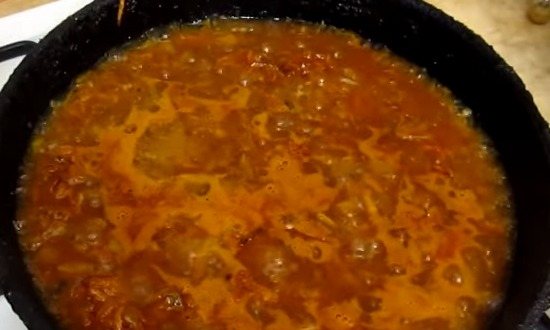 5. Влити підливу, перемішати, накрити кришкою, зменшити вогонь, гасити 4-5 хвилин. Потім зняти кришку і постійно помішуючи, потримати ще на плиті 3-4 хвилини.