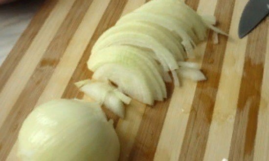 І так цибулину чистимо, ріжемо тоненькими півкільцями.