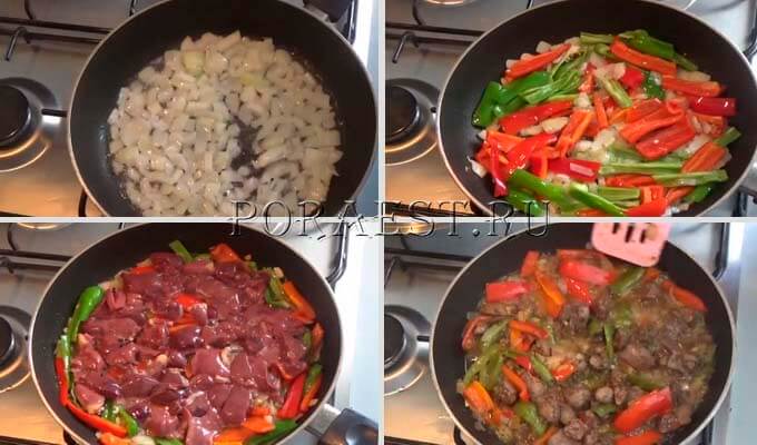 Спочатку на сковороді підсмажити до м’якості цибулю, потім викласти до неї солодкий перець, перемішати, трохи потримати на вогні та покласти дрібно нарізаний часник. Потім викласти печінку, додати хмелі-сунелі, перемішати, накрити кришкою і гасити 3-4 хвилини, потім відкрити кришку і ще 3-4 хвилини смажити без кришки.